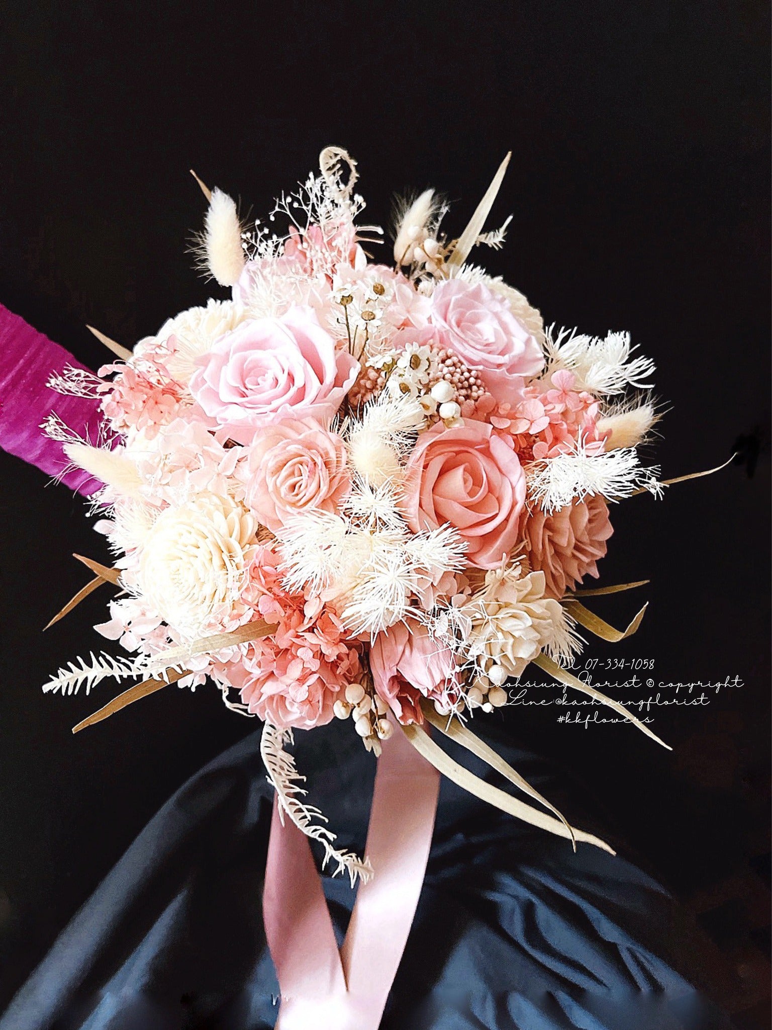不同於鮮花的短暫,美麗將長久停駐,象徵愛情恆久不變。此款捧花不會凋謝,能永久保存,婚禮當日成為幸福見證,日後亦可珍藏於家中,時刻重溫初見的悸動與誓言。