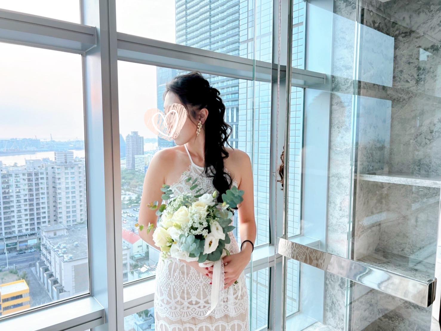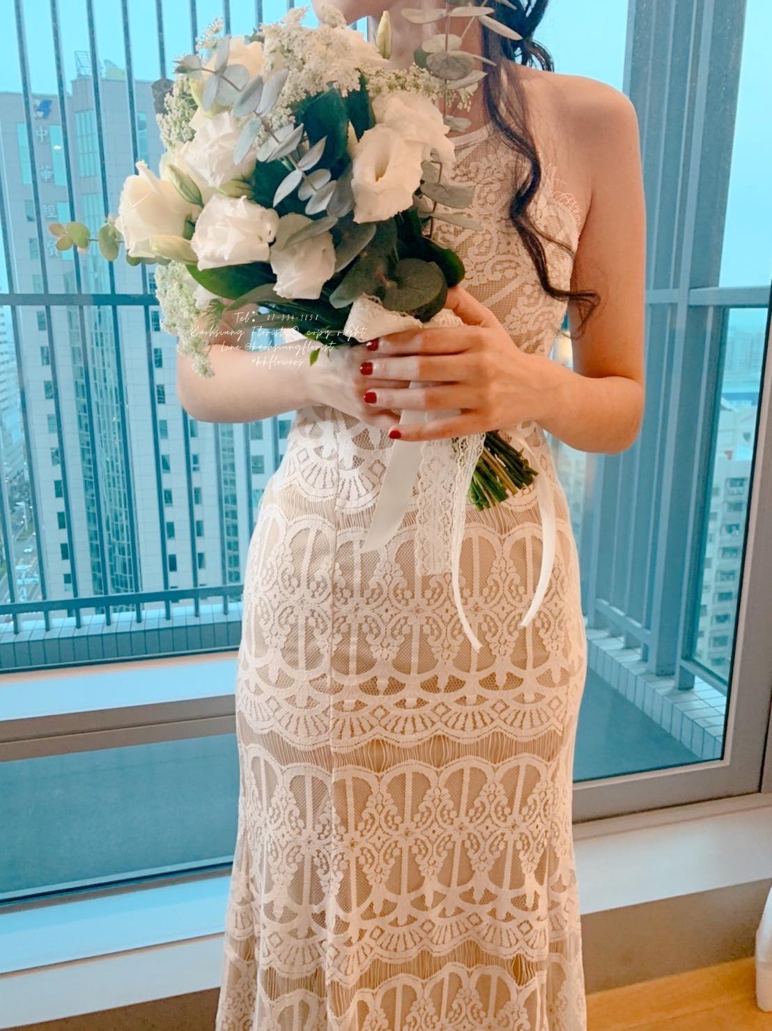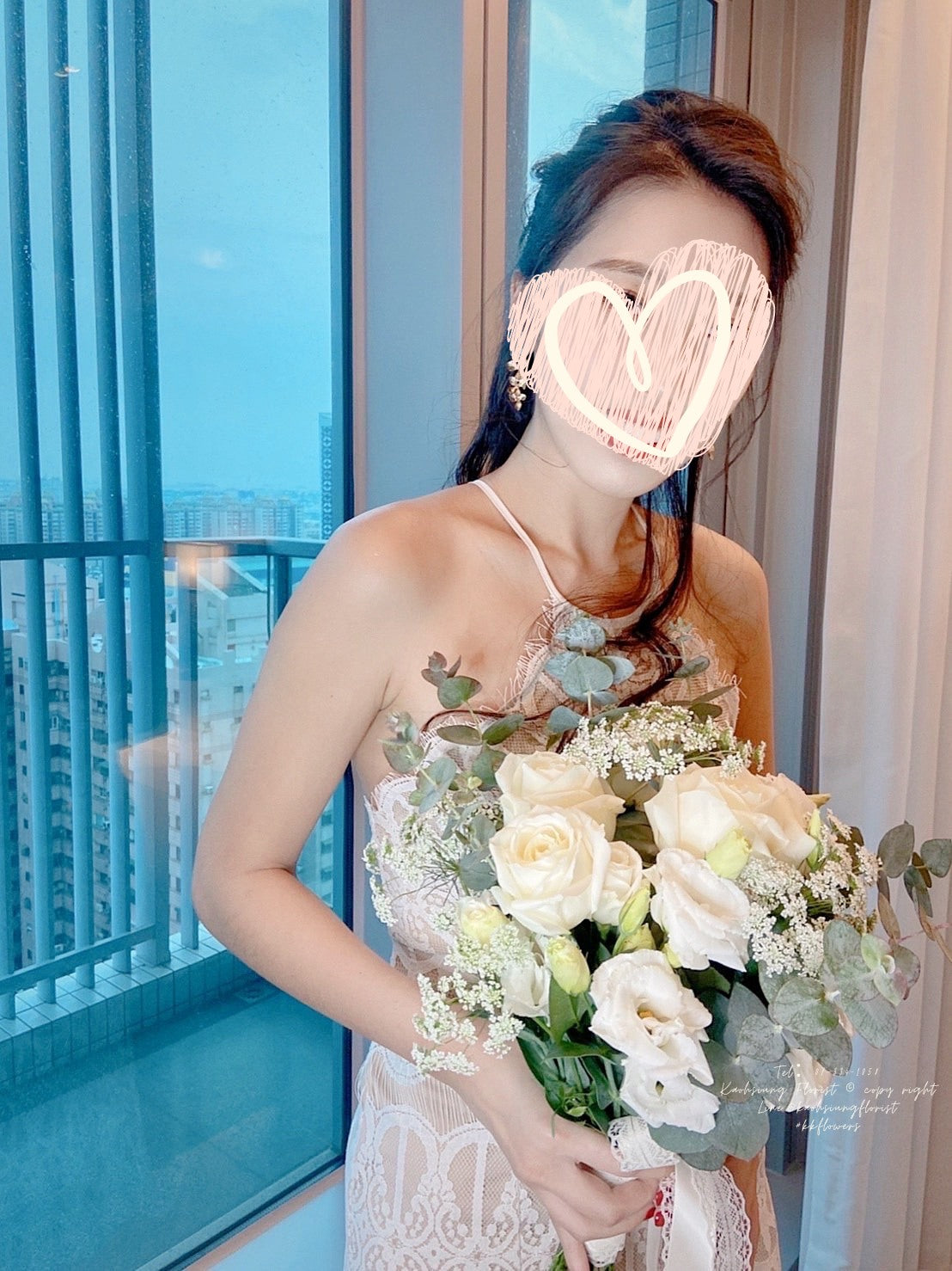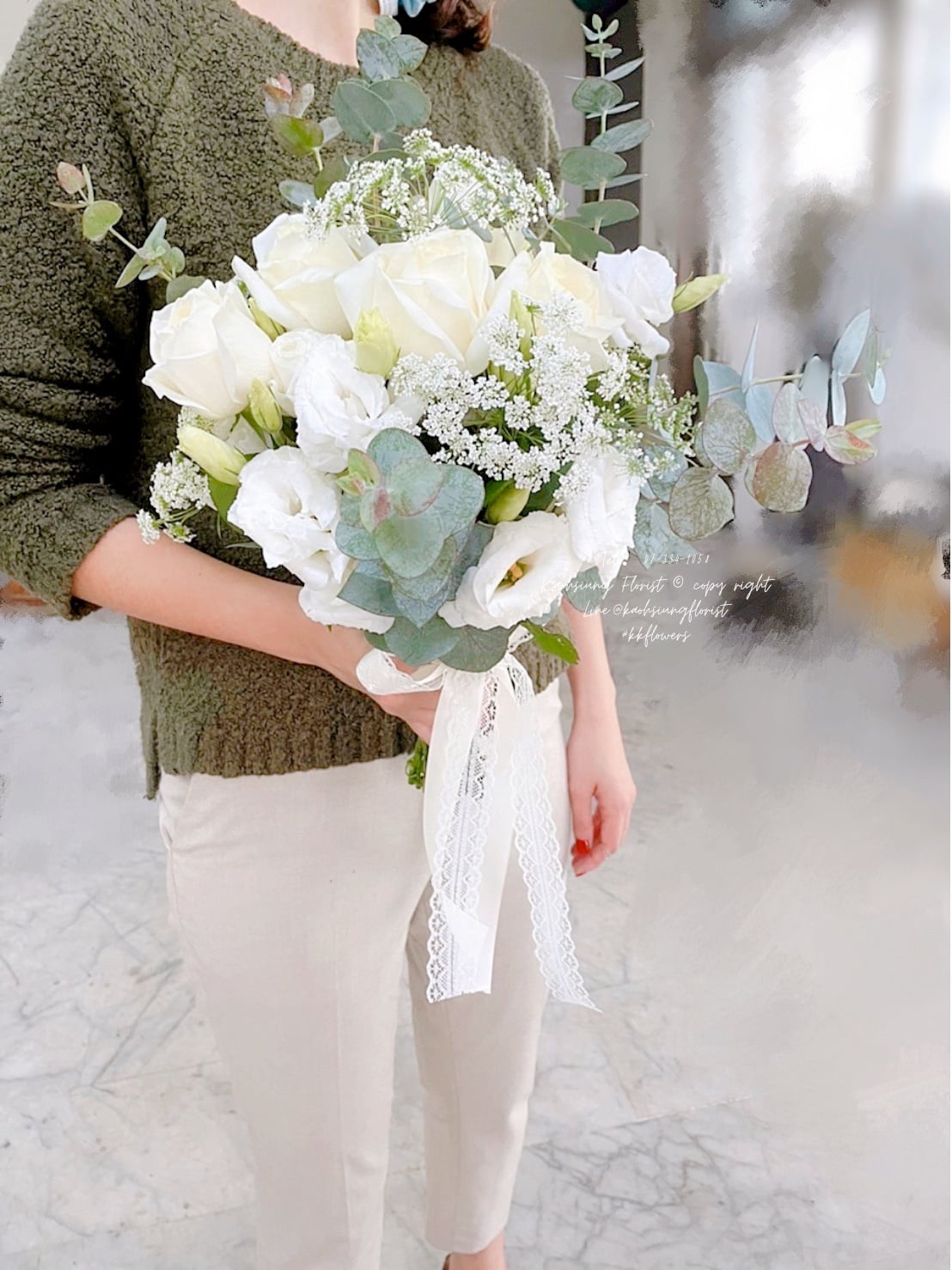 以純白玫瑰與洋桔梗為主角,點綴輕盈蕾絲花與尤加利葉,交織出一份純潔無瑕的愛。這份捧花象徵永恆與承諾,就如同新人在婚禮上的誓言般真摯而浪漫。讓白色花語,見證專屬於你們的幸福時刻。