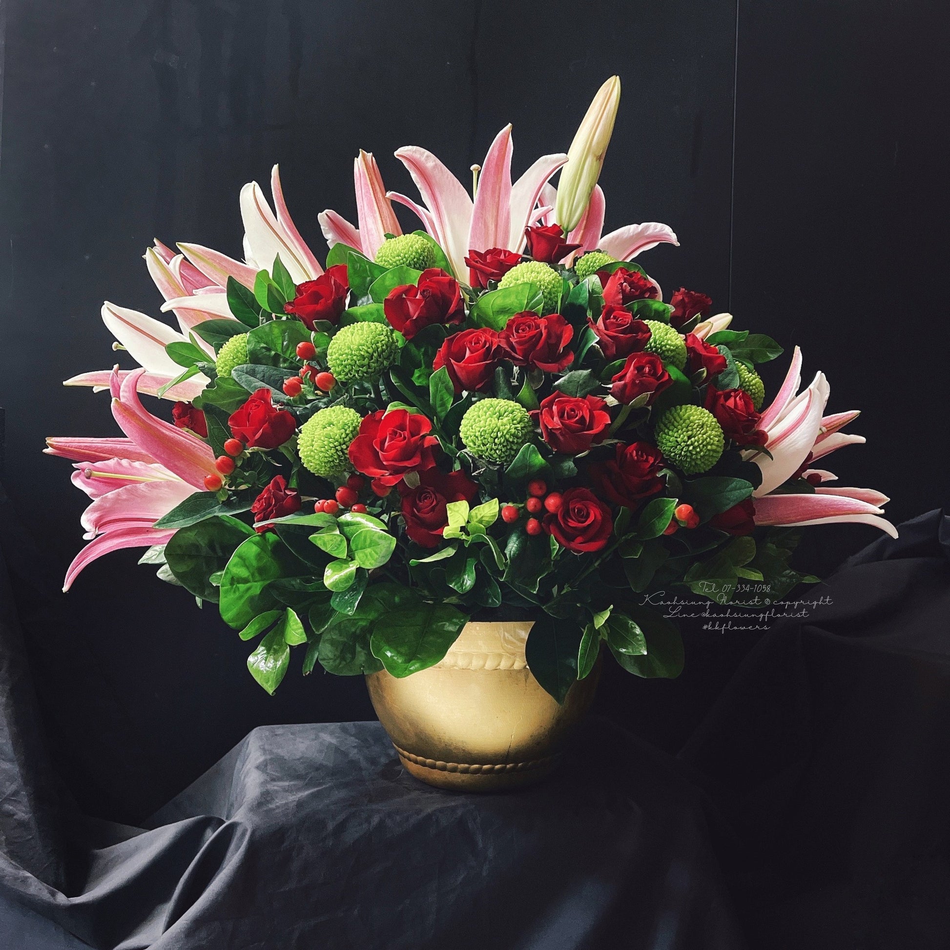 主花為玫瑰、百合,蝴蝶蘭、搭配綠色系花材。