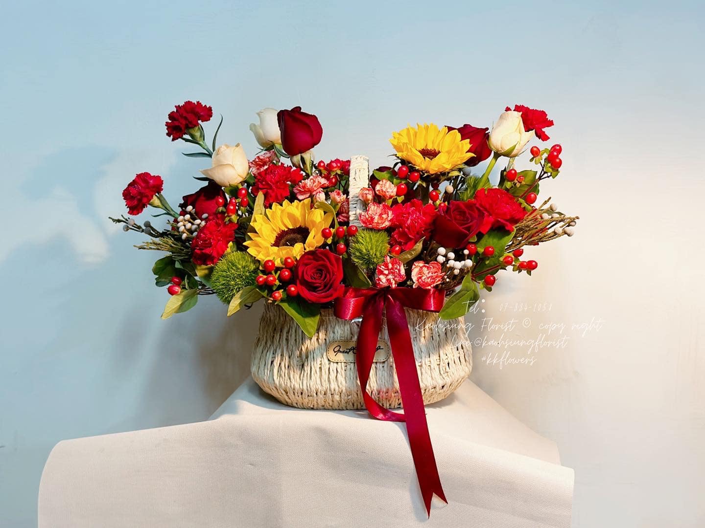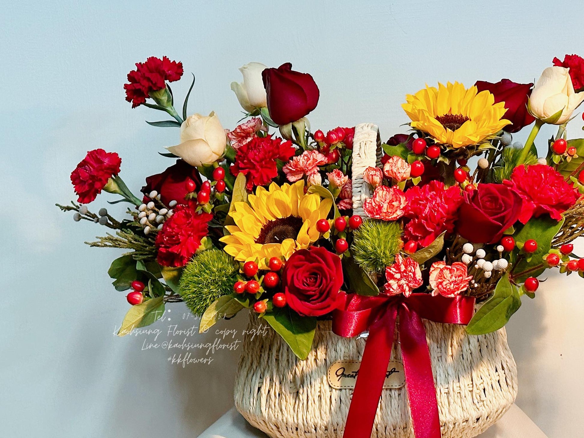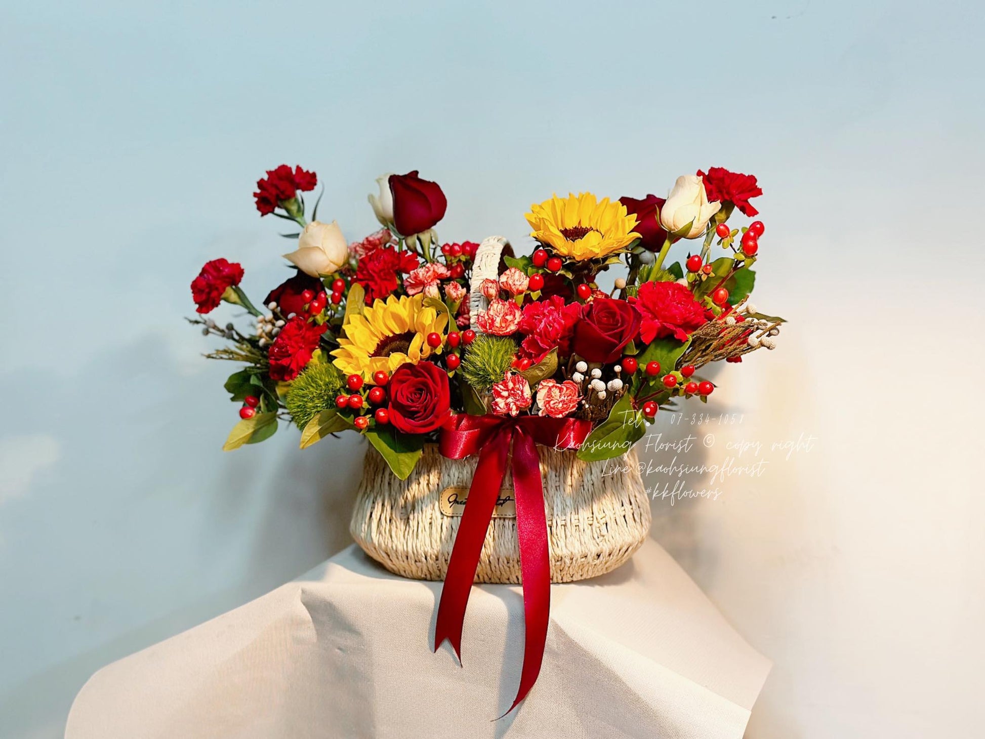 主花為向日葵、紅玫瑰,搭配綠色系花材。