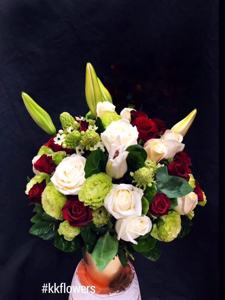 主花為玫瑰、百合、桔梗,搭配綠色系花材。