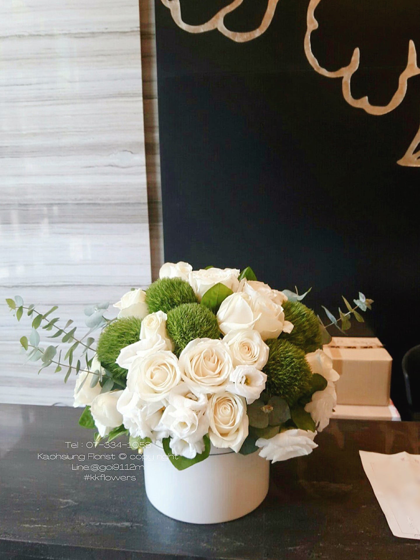 主花為白玫瑰、白桔梗,搭配綠色系花材。