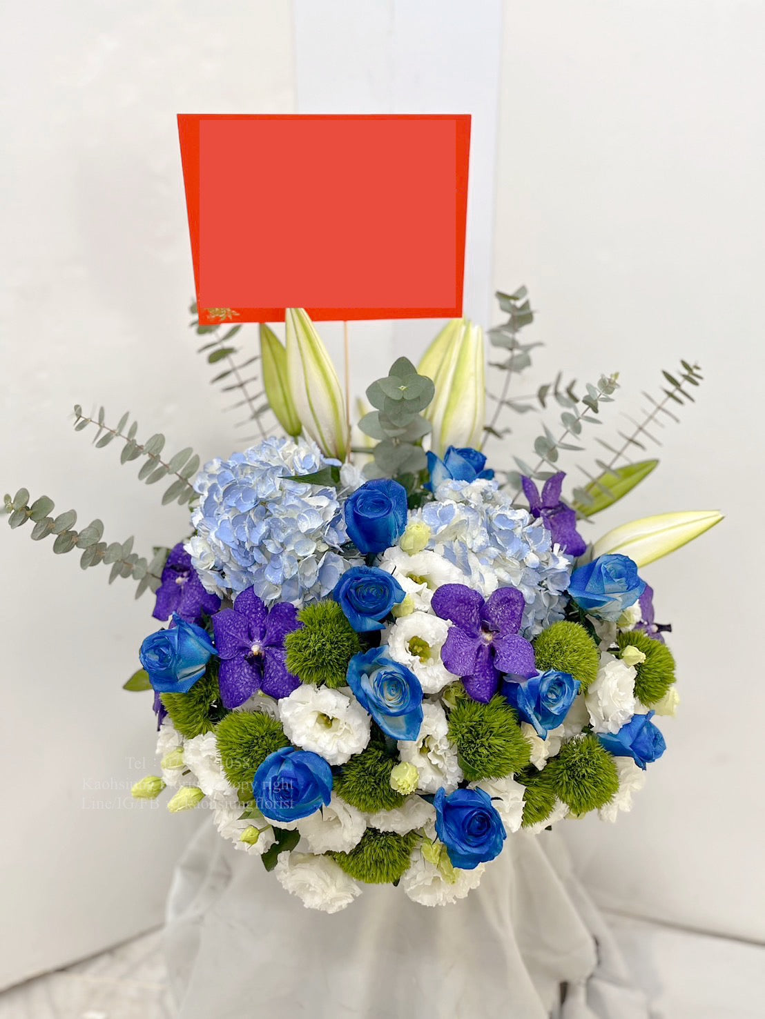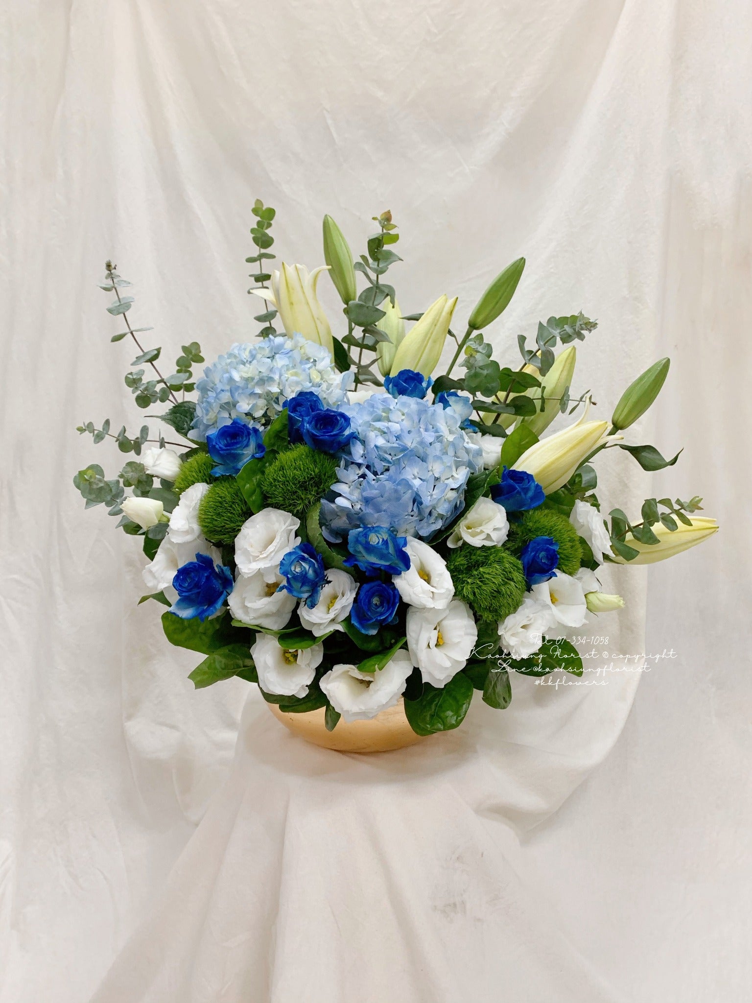 主花為藍玫瑰、白桔梗、百合,搭配綠色系花材