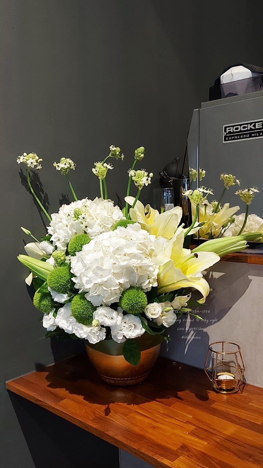 主花為白玫瑰、白桔梗,搭配綠色系花材。