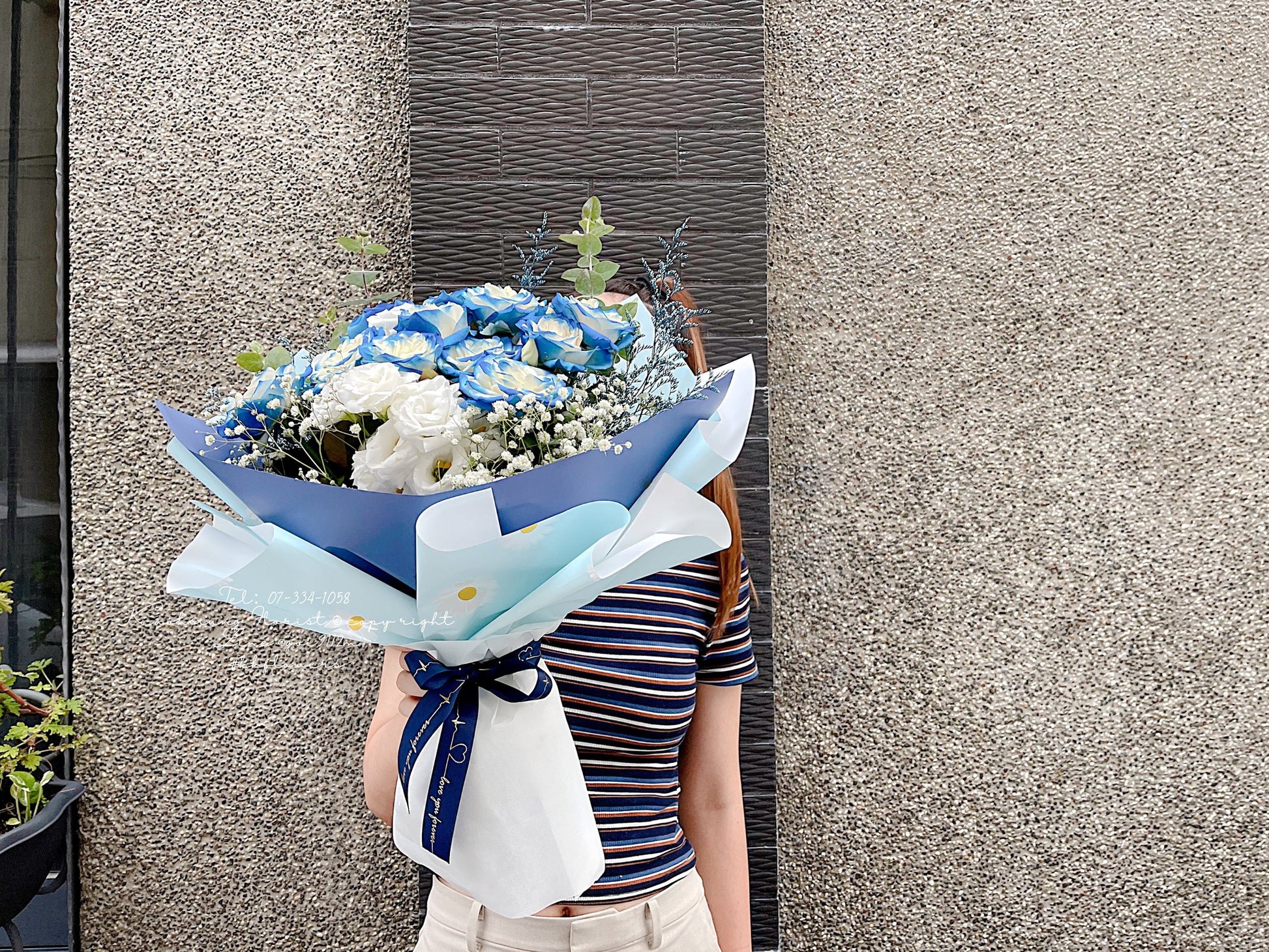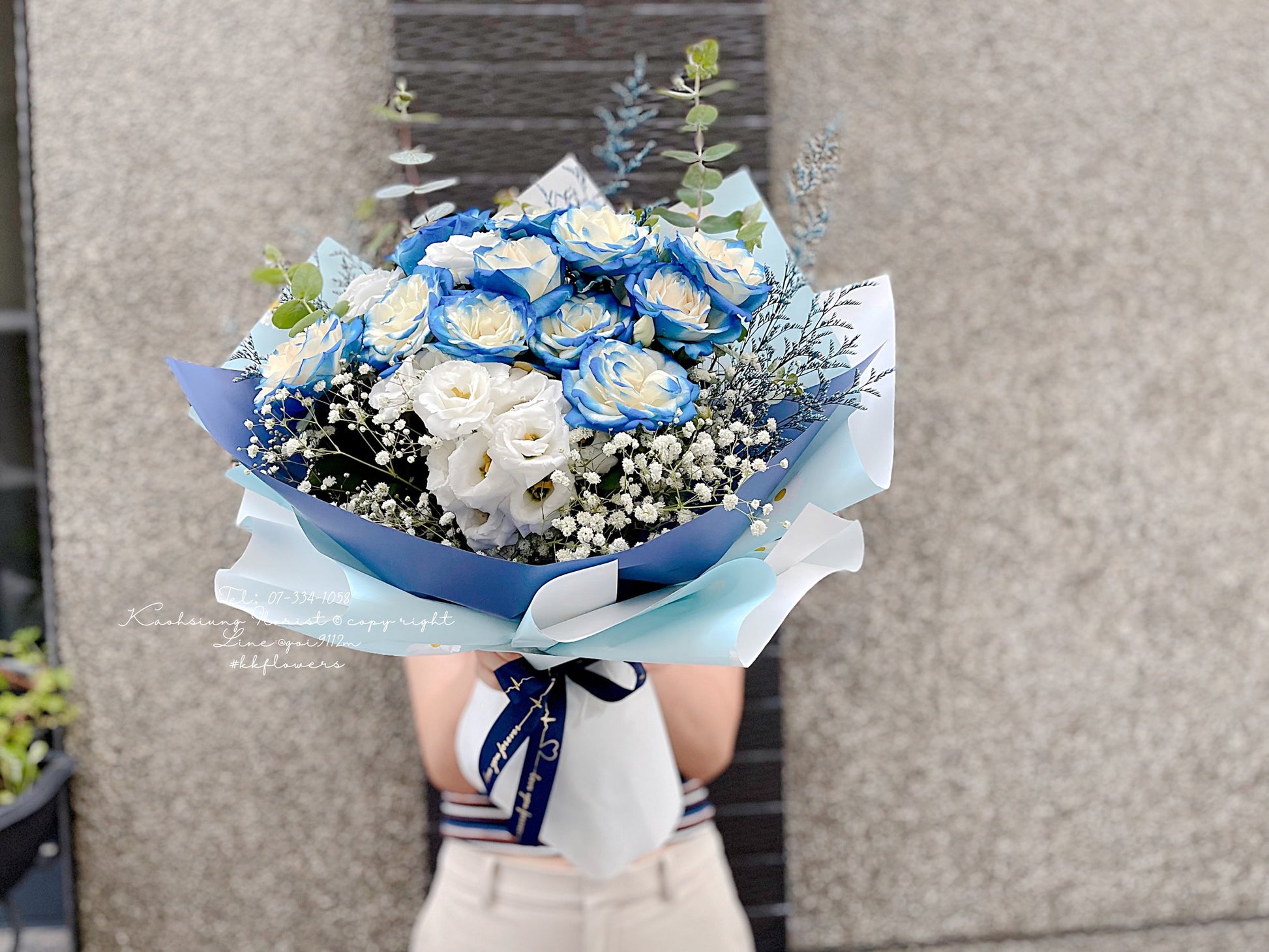 主花為11朵藍玫瑰,白桔梗,滿天星,搭配綠色花材。