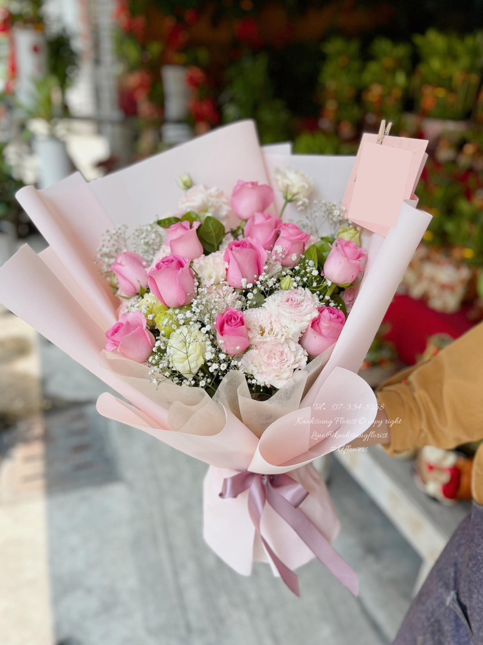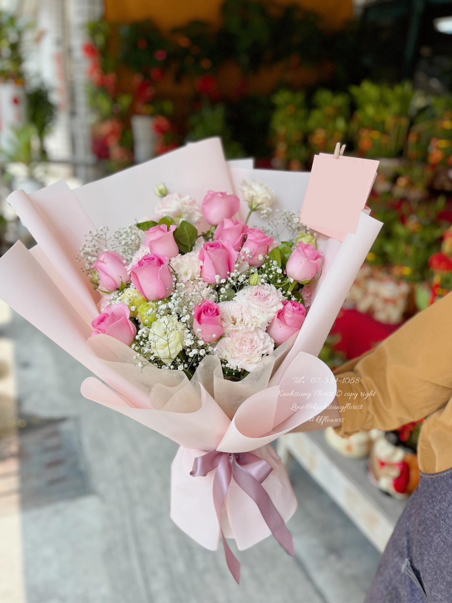 主花為11朵粉玫瑰,搭配粉色系配花。