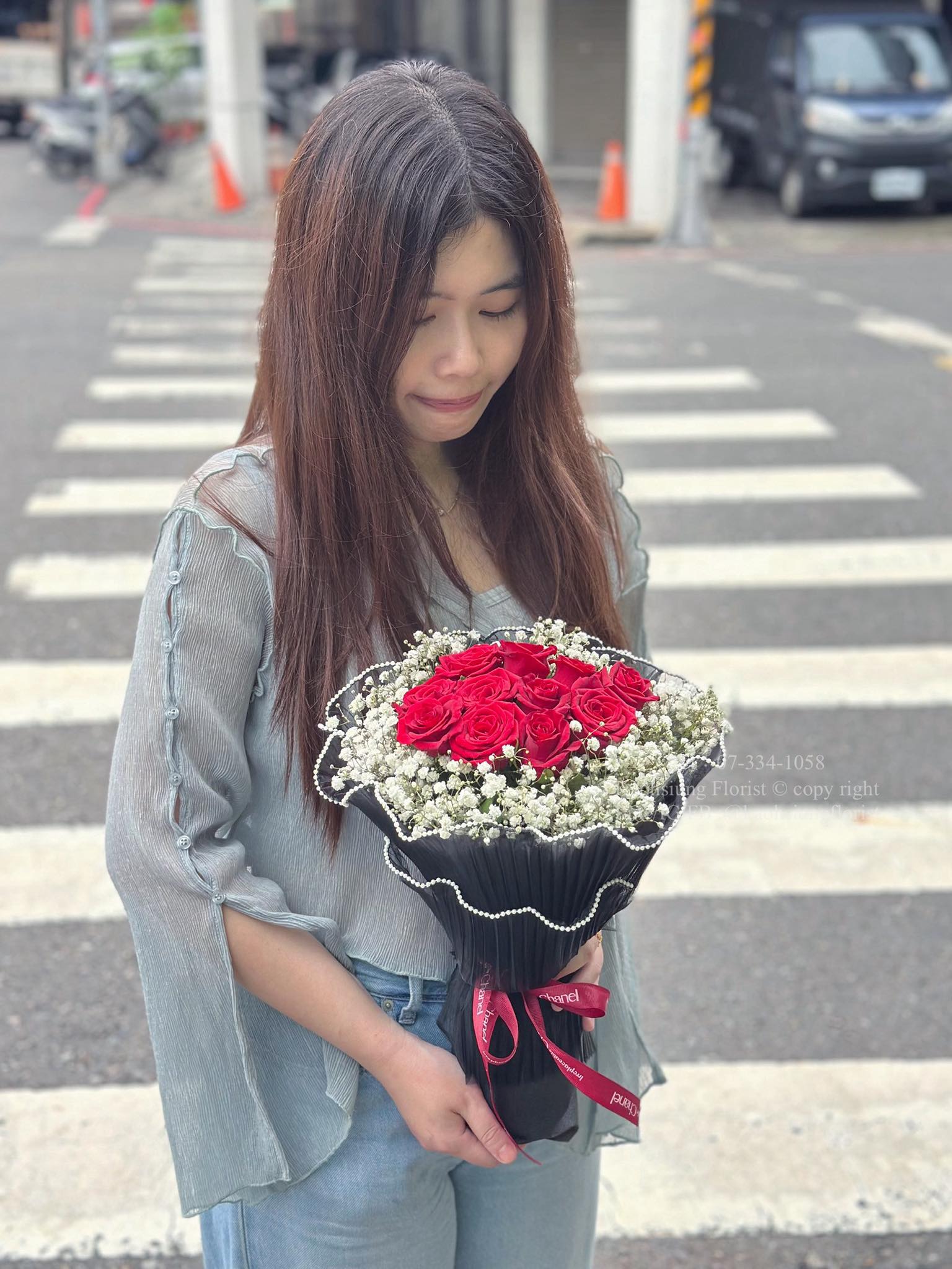 輕紗細語,玫瑰傳情。一抹緋紅藏在柔和的輕紗之中,像是將心底的悸動低語訴說。滿天星點綴純白思念,每一朵玫瑰都是一段專屬於你的心語。以優雅的紗輕輕包裹,把這份深情獻給最在意的那個人。