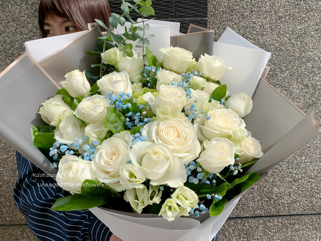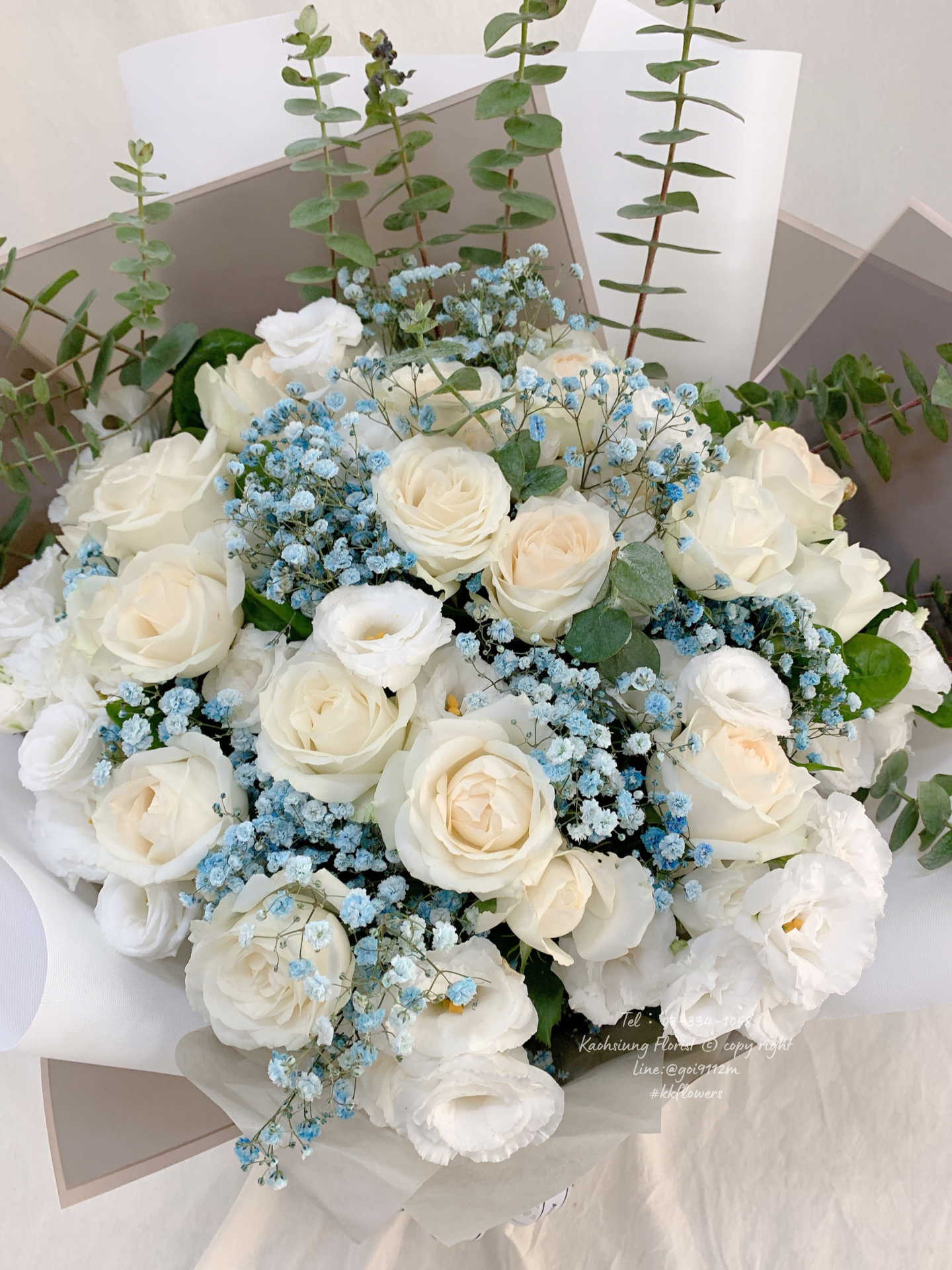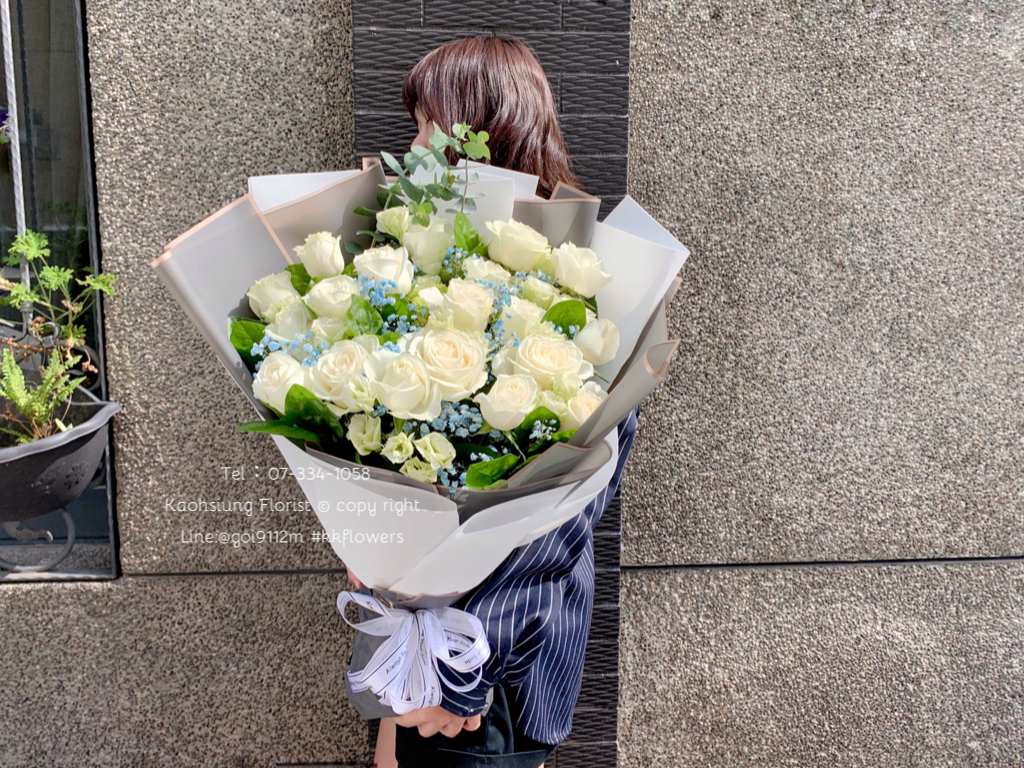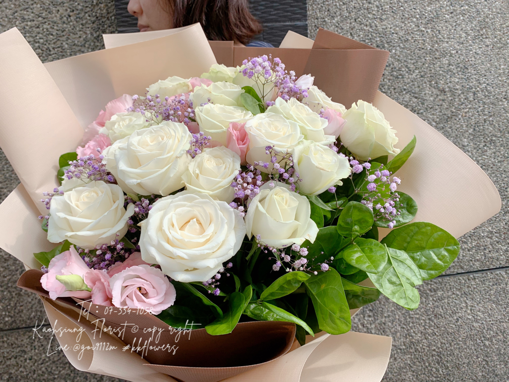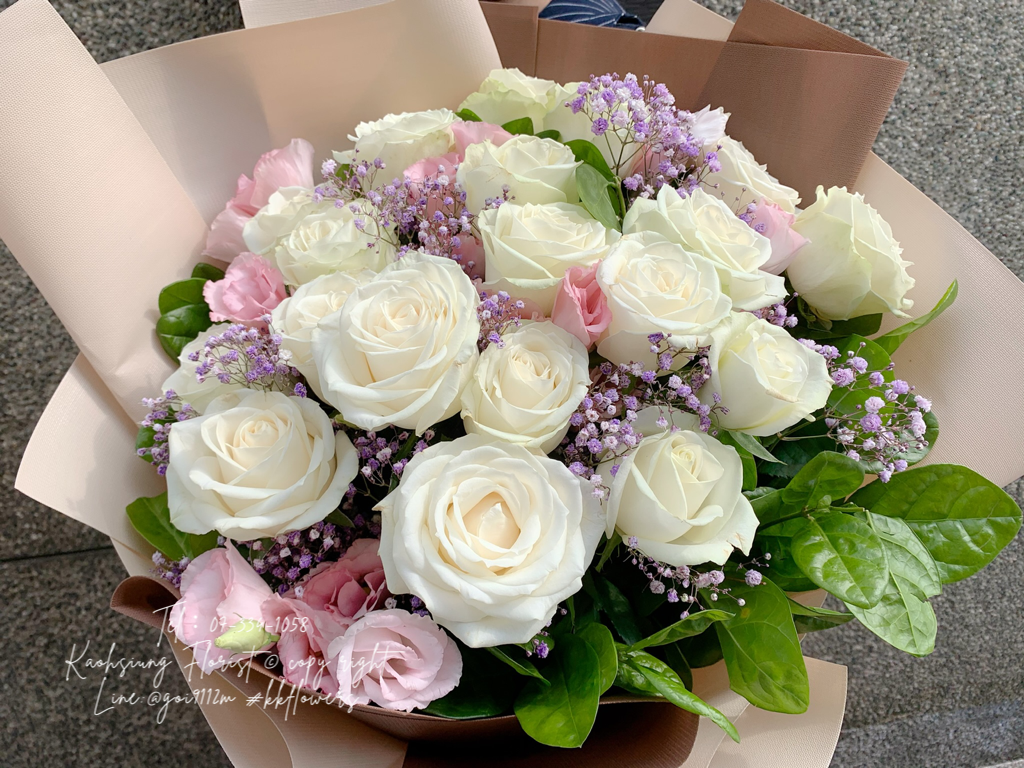 主花為20朵白玫瑰。夏天台灣玫瑰會相較冬天玫瑰比較小朵。