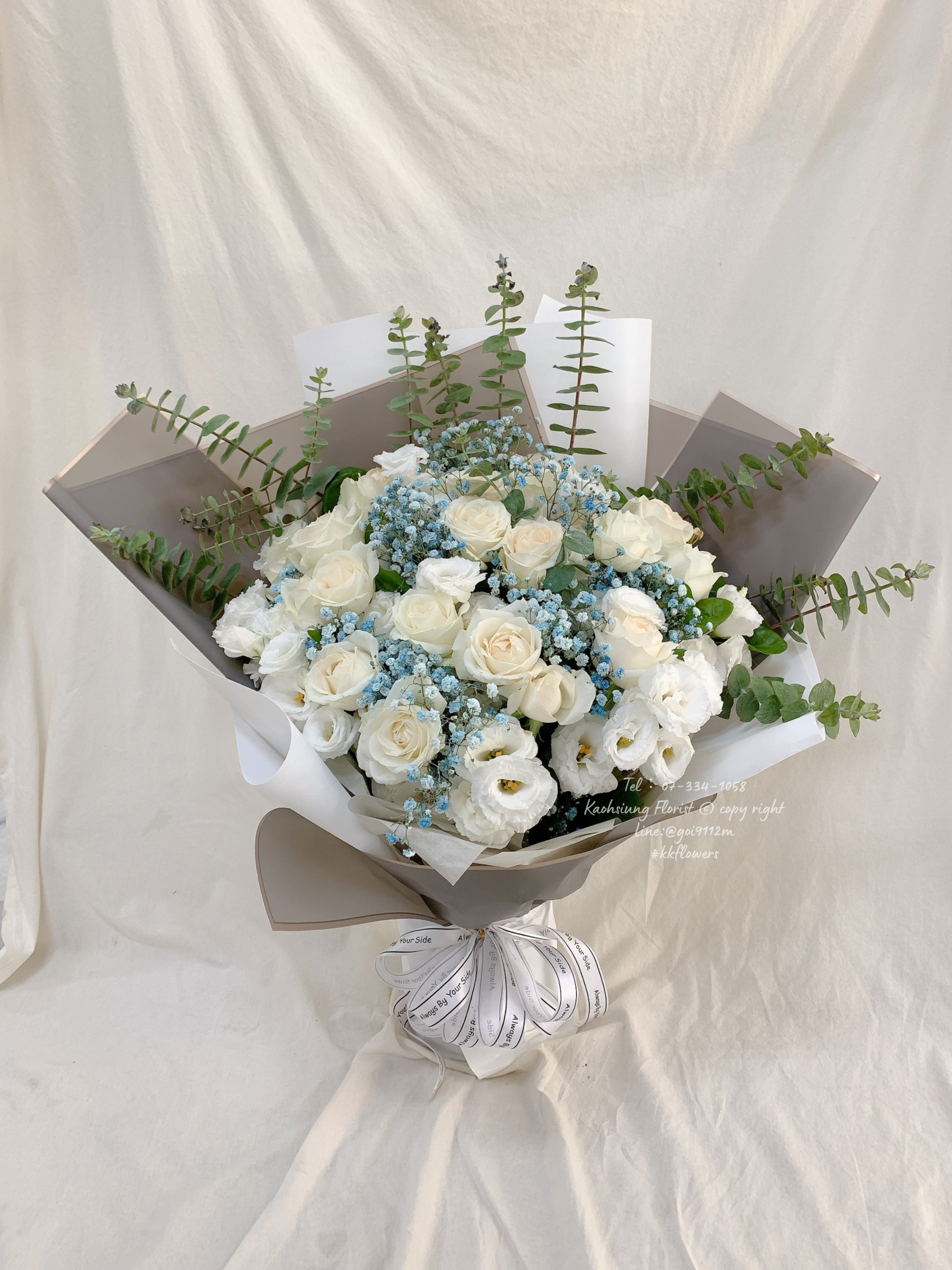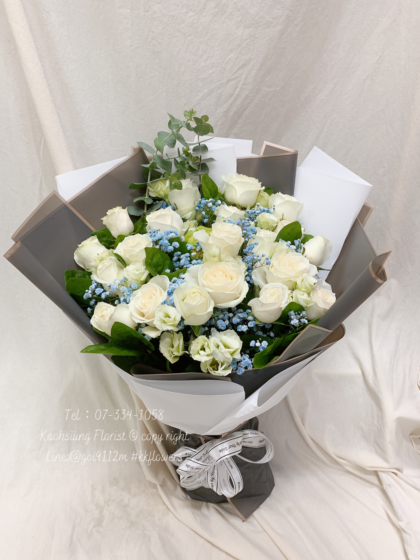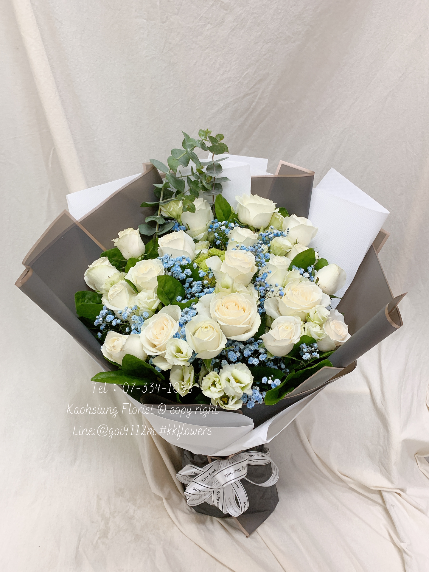 主花為20朵白玫瑰。夏天台灣玫瑰會相較冬天玫瑰比較小朵。