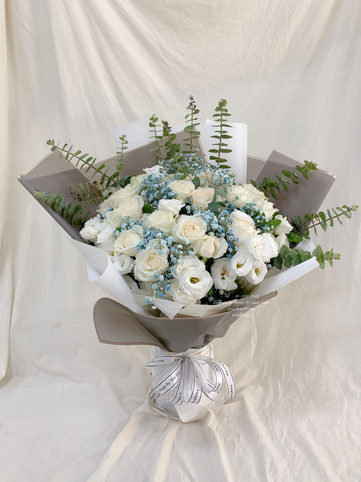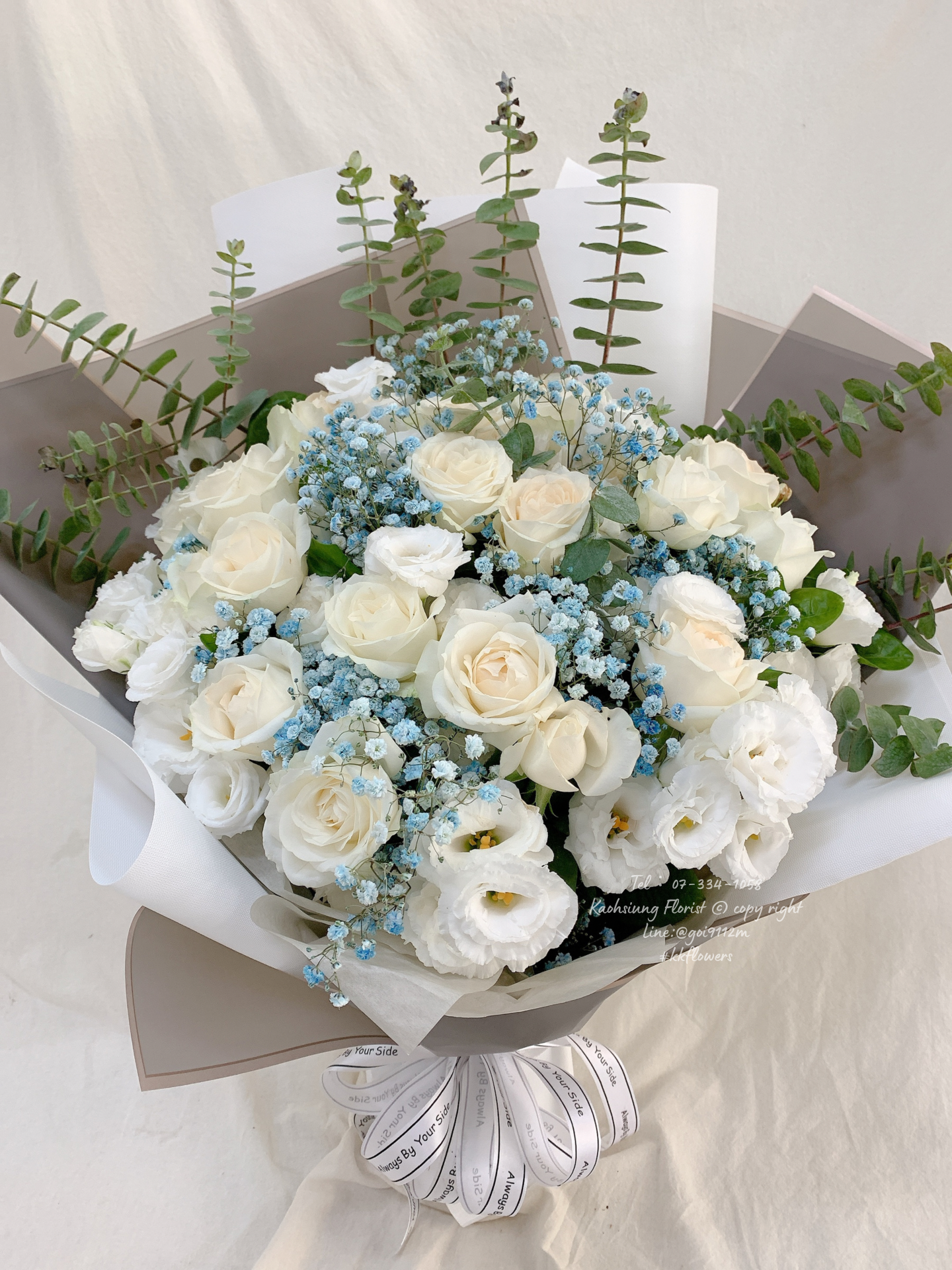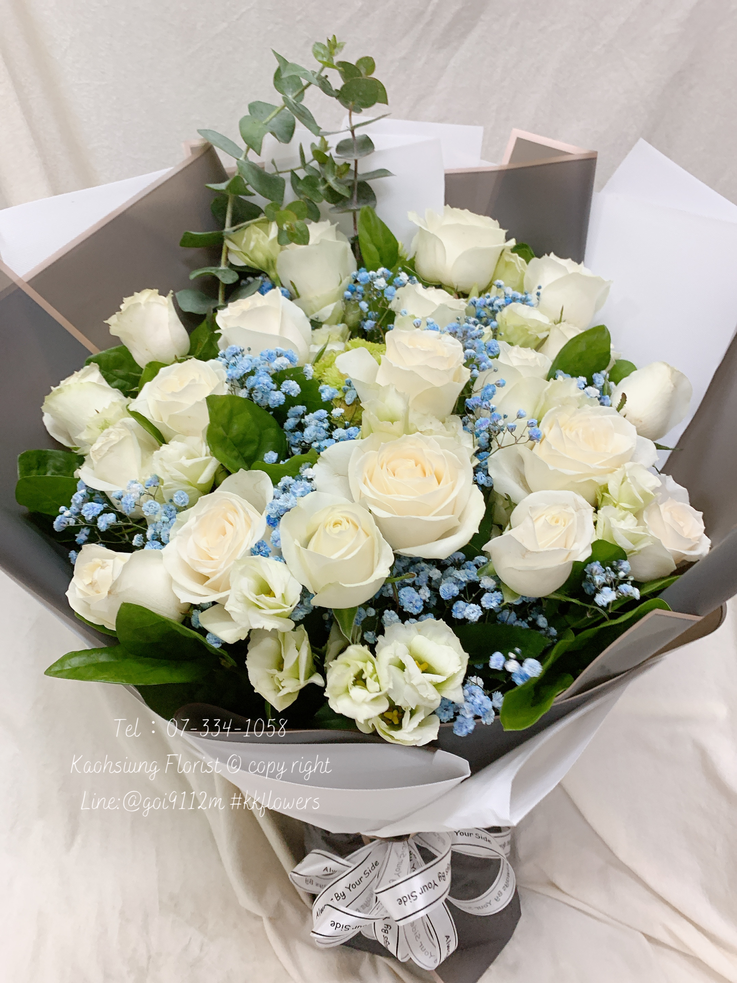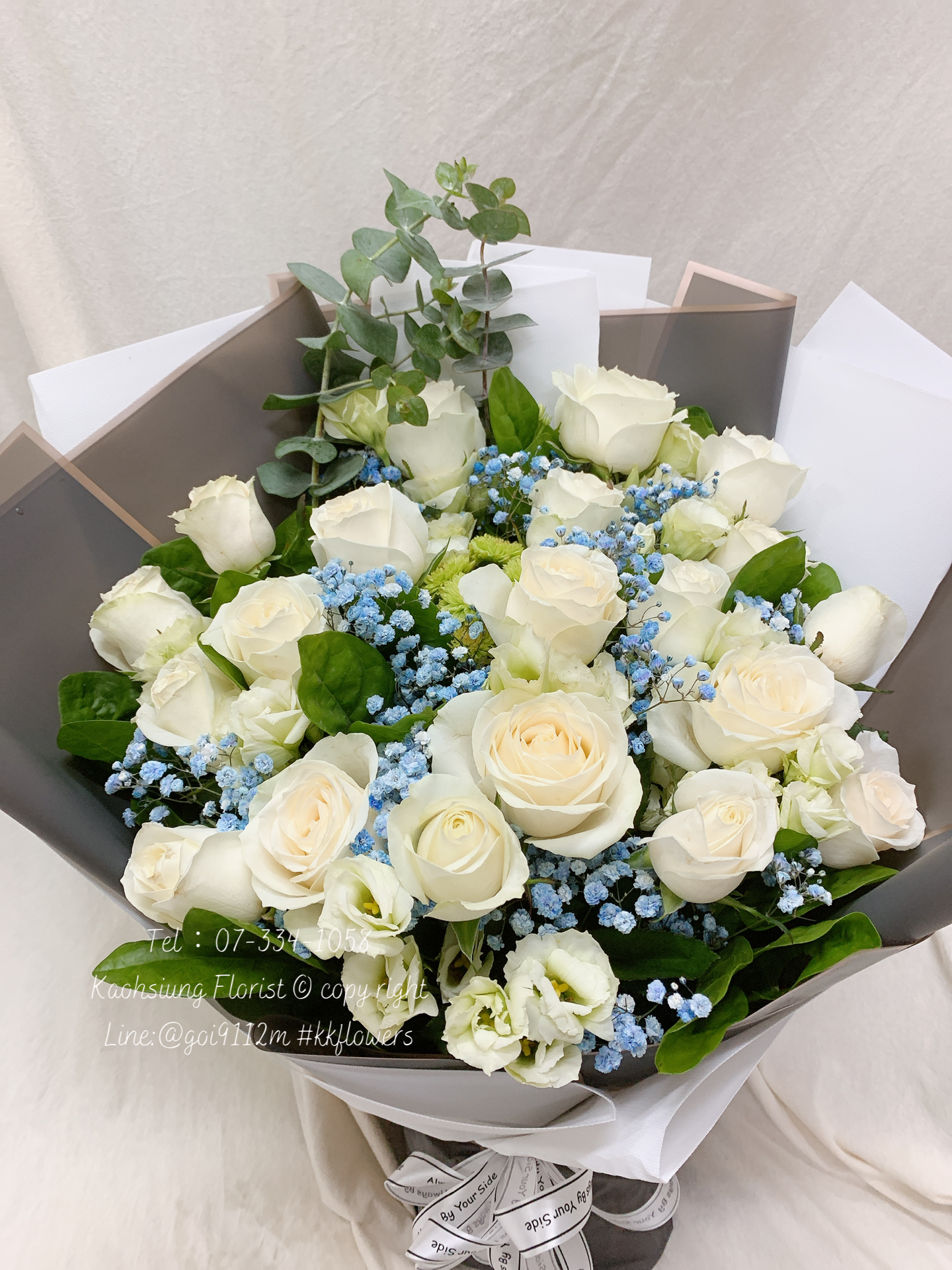 主花為20朵白玫瑰。夏天台灣玫瑰會相較冬天玫瑰比較小朵。