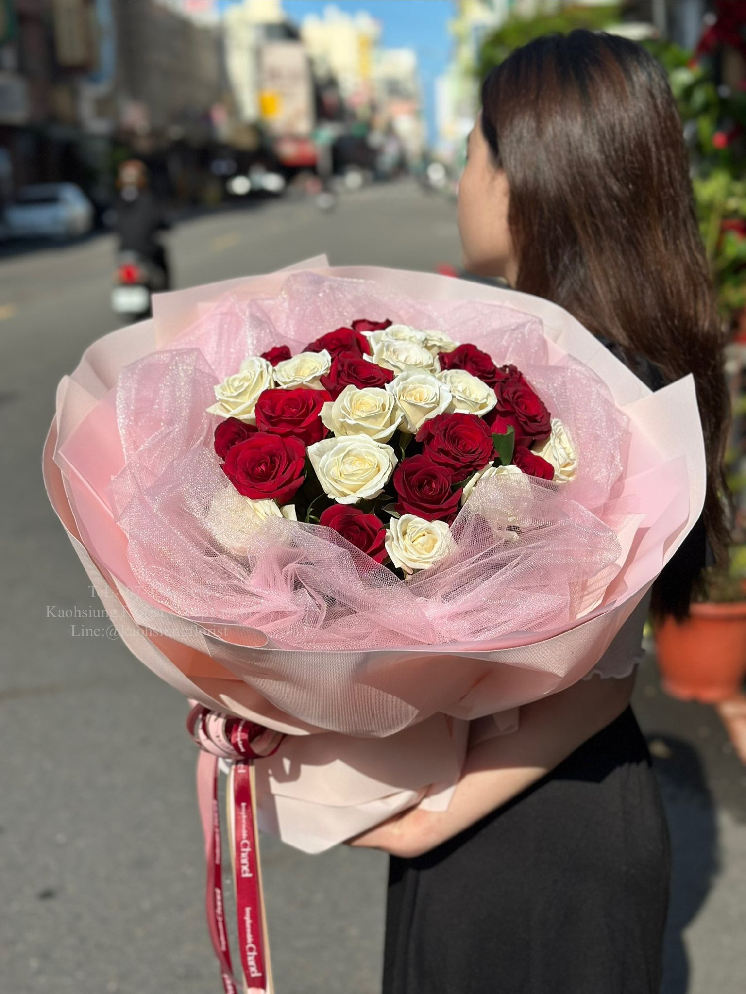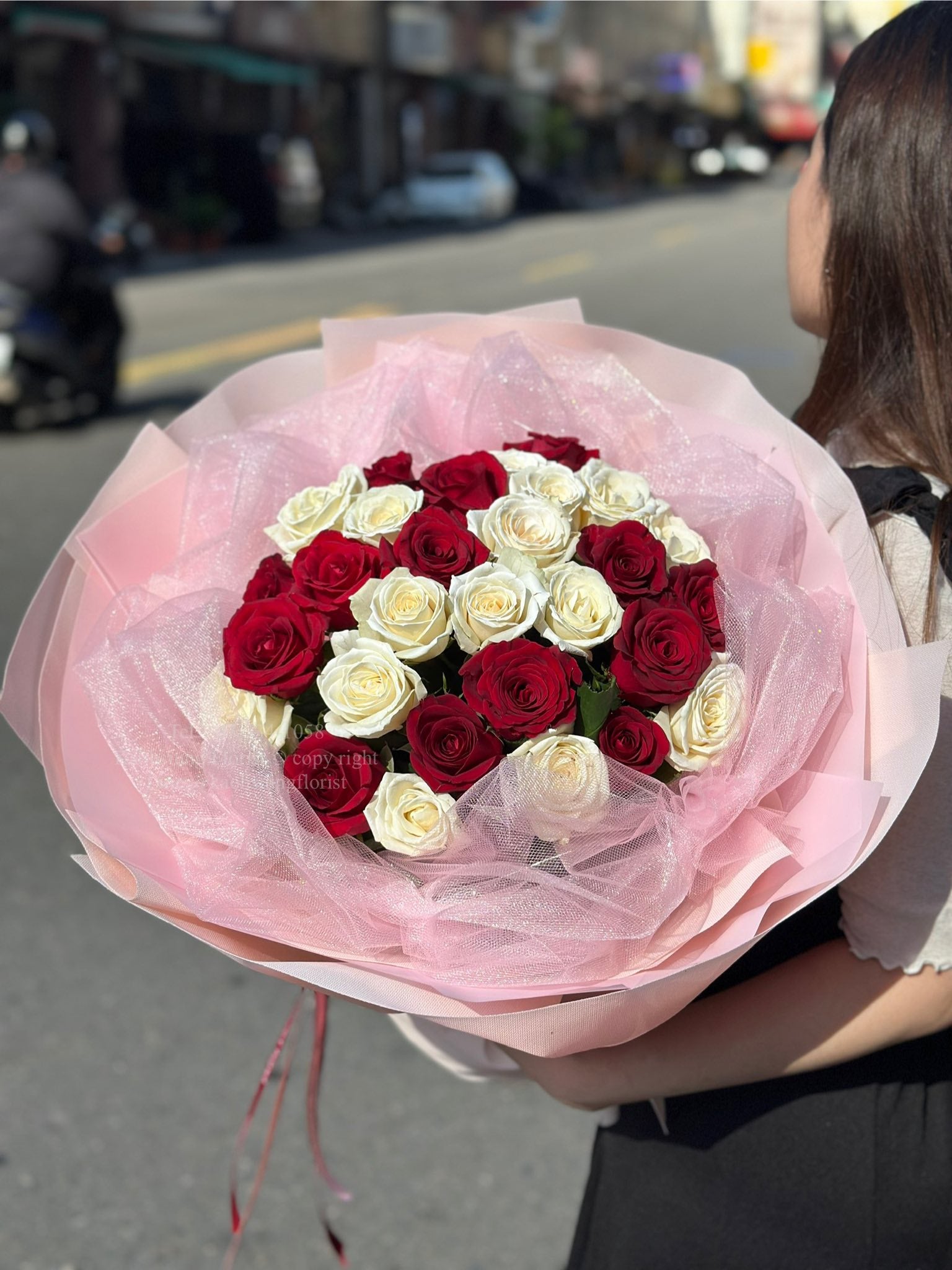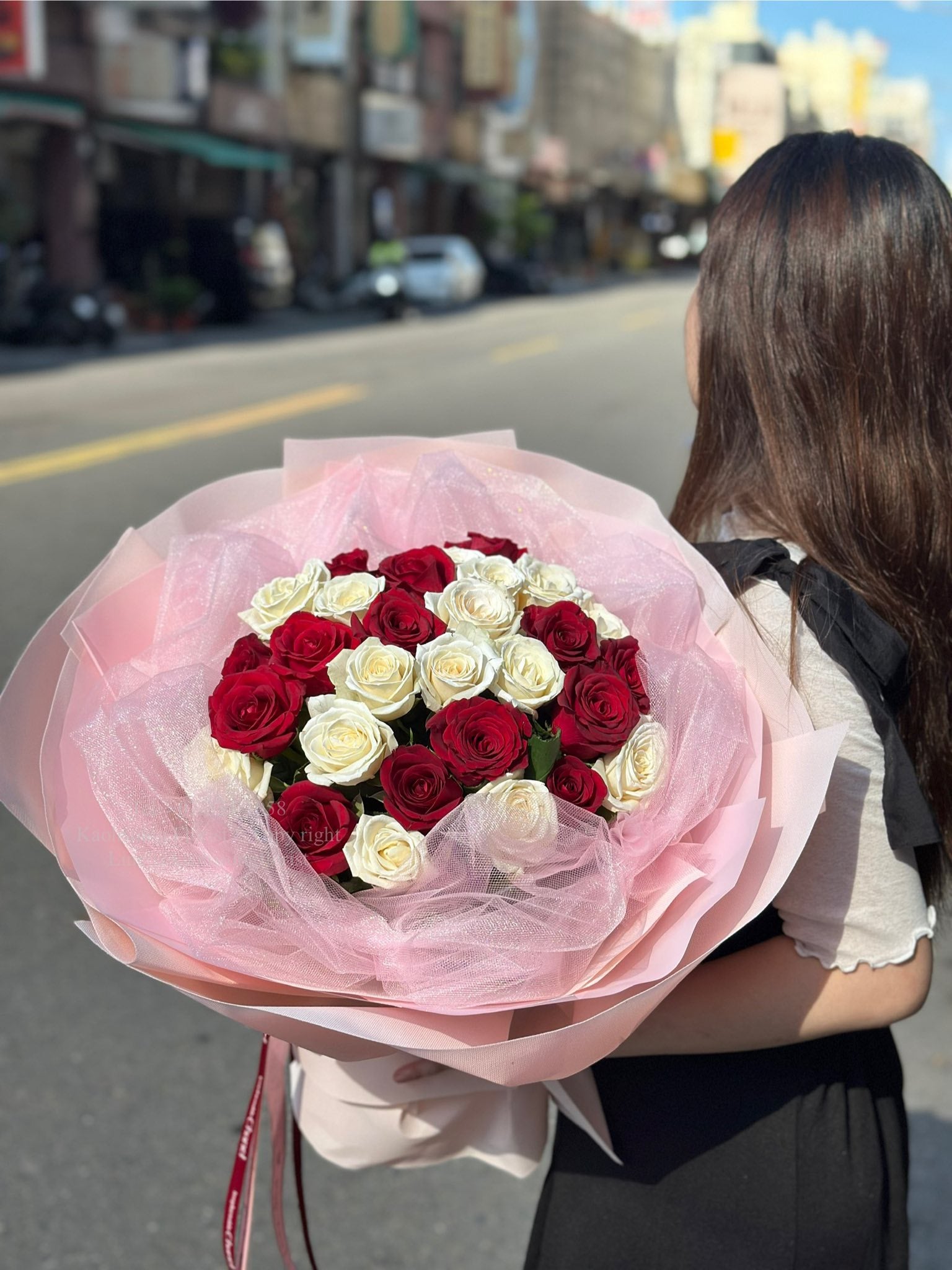 玫瑰的深情,在紅與白的交錯中悄然綻放,輕柔粉紗包裹著滿滿心意,彷彿將思念輕輕繫上。這份花禮,如同愛的寄語,不需言語,卻足以感動人心。無論是表白、慶祝或送給最重要的那個人,都讓這份溫柔,隨紗一同傳遞。