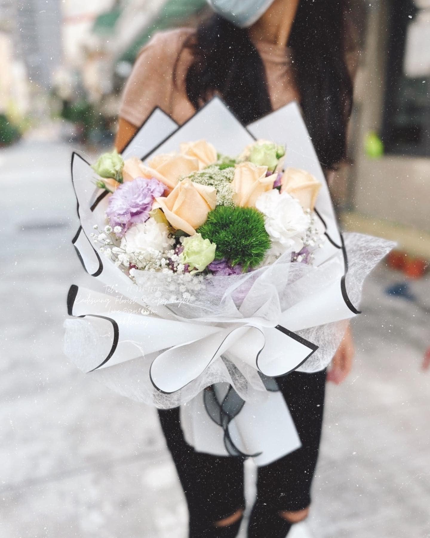 主花為九朵香檳玫瑰,搭配桔梗,以及白紫綠色花材。