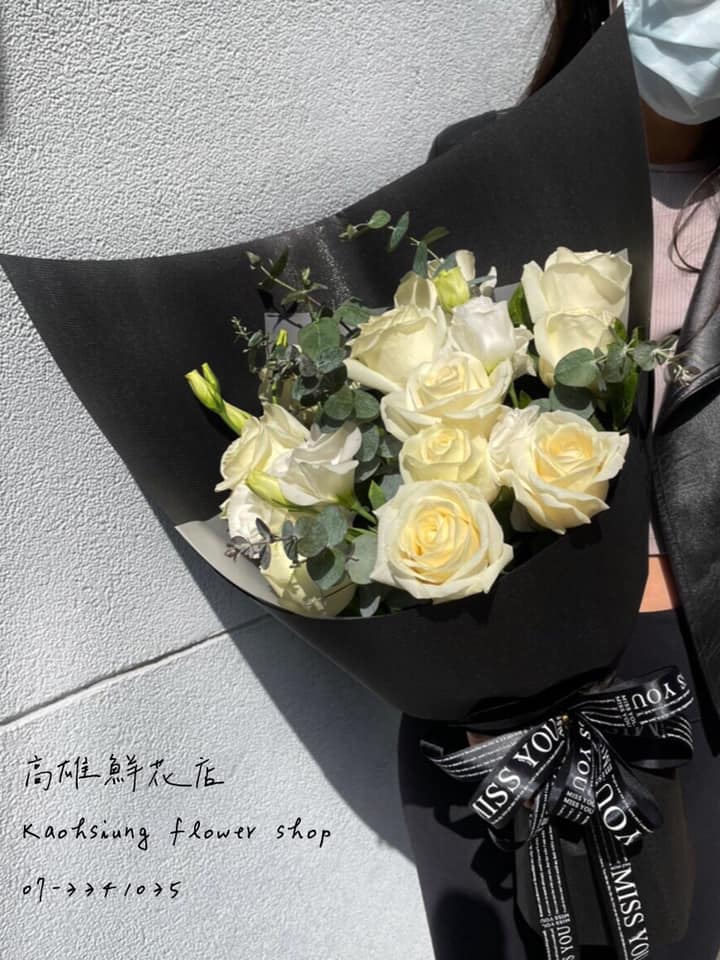 主花為9朵白玫瑰,搭配白綠色系配花。