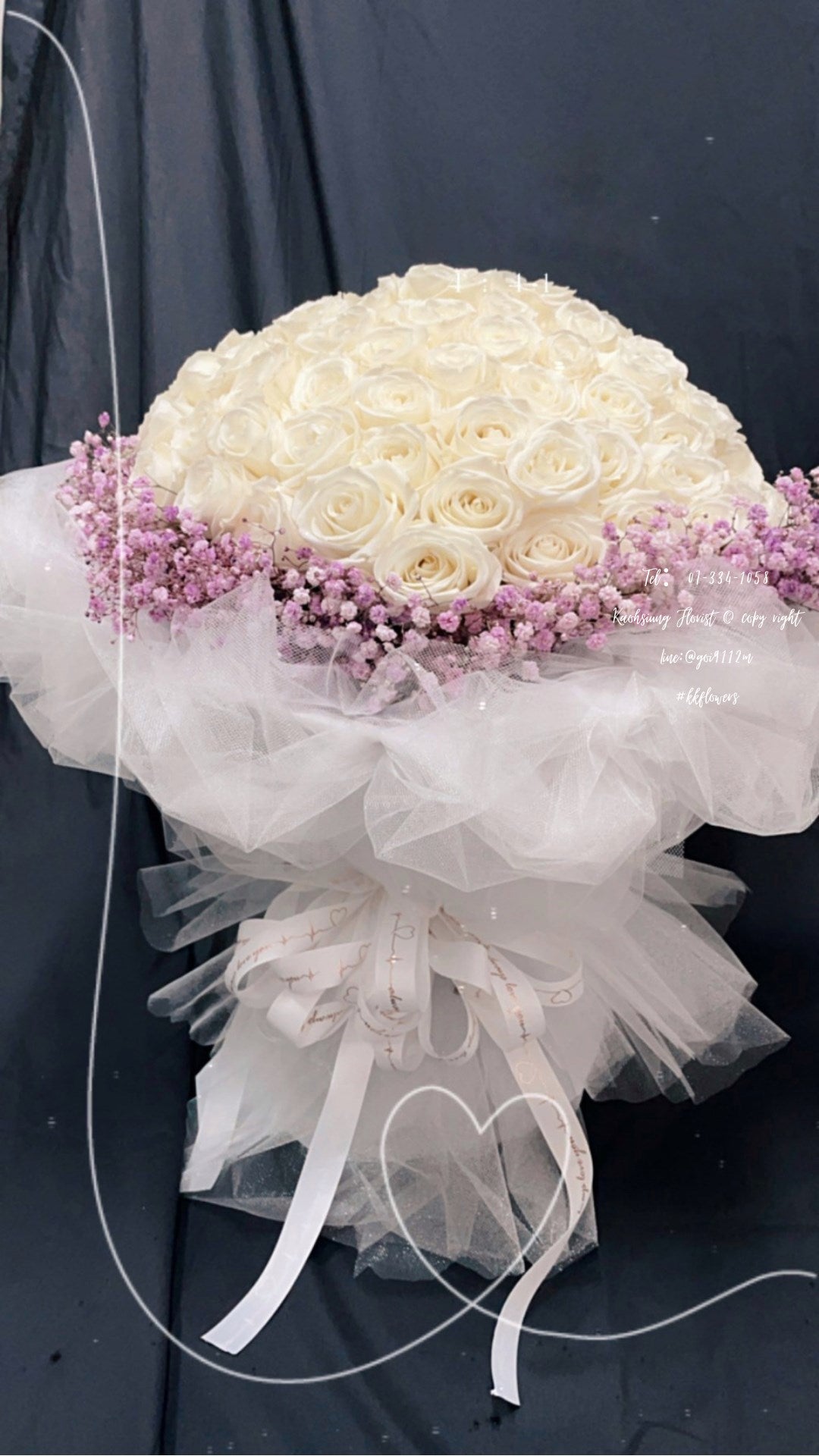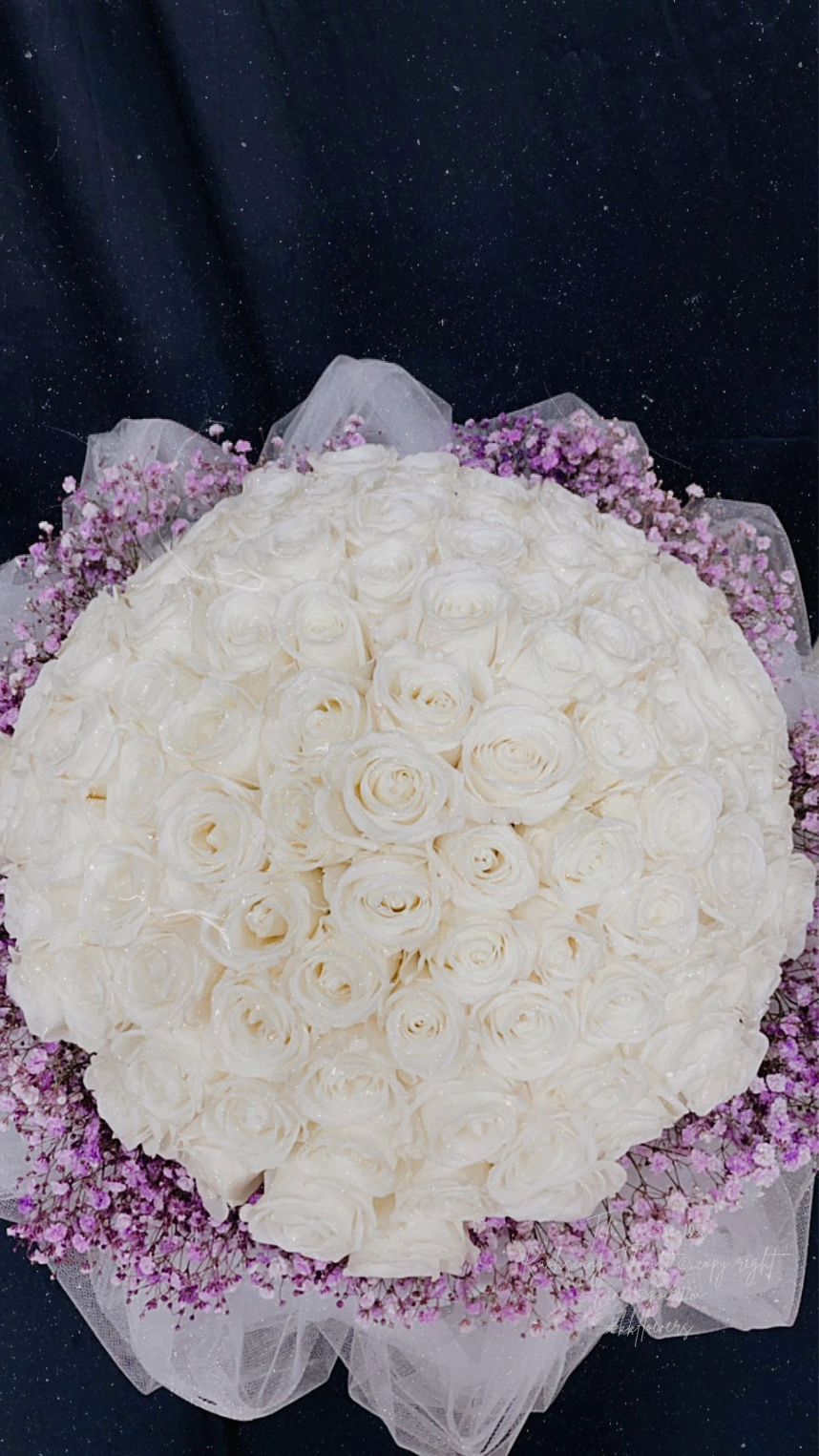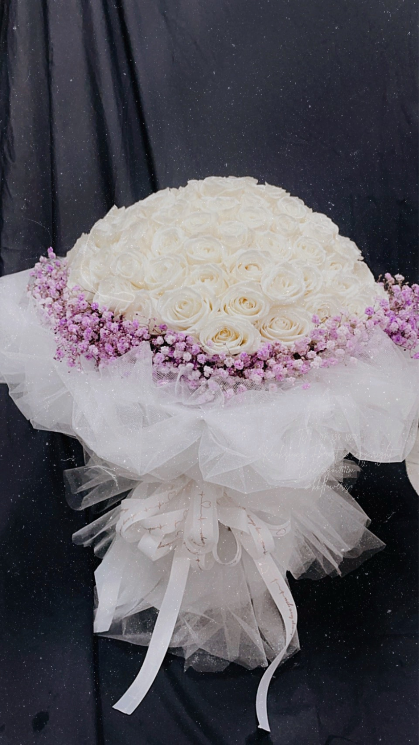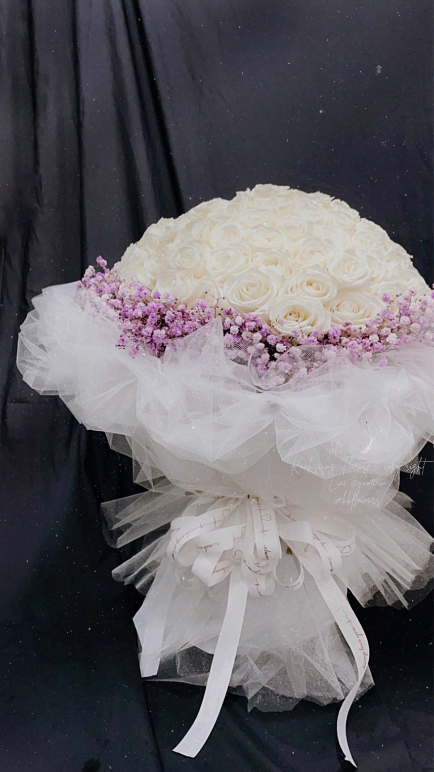 主花為99朵白玫瑰,搭配粉色滿天星。